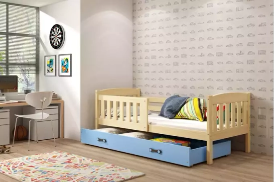 Łóżko młodzieżowe pojedyncze KUBUŚ 80X190 z szufladą, sosna/niebieskie