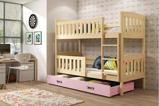 Łóżko młodzieżowe piętrowe KUBUŚ 90X190 z szufladą, sosna/różowe