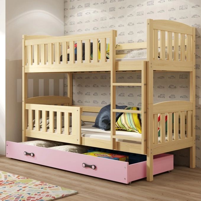 Zestaw obejmuje dwa wygodne materace o grubości 7 cm, każdy z hipoalergicznym pokrowcem, co zapewnia zdrowy i komfortowy sen. Stelaż łóżka, wykonany z listew brzozowych, zapewnia odpowiednie wsparcie dla kręgosłupa. Szuflada, w uroczym różowym kolorze, umieszczona pod łóżkiem, wyposażona jest w praktyczne kółka, co ułatwia jej przesuwanie. Idealnie nadaje się na przechowywanie pościeli, zabawek czy książek, pomagając w utrzymaniu porządku w pokoju.