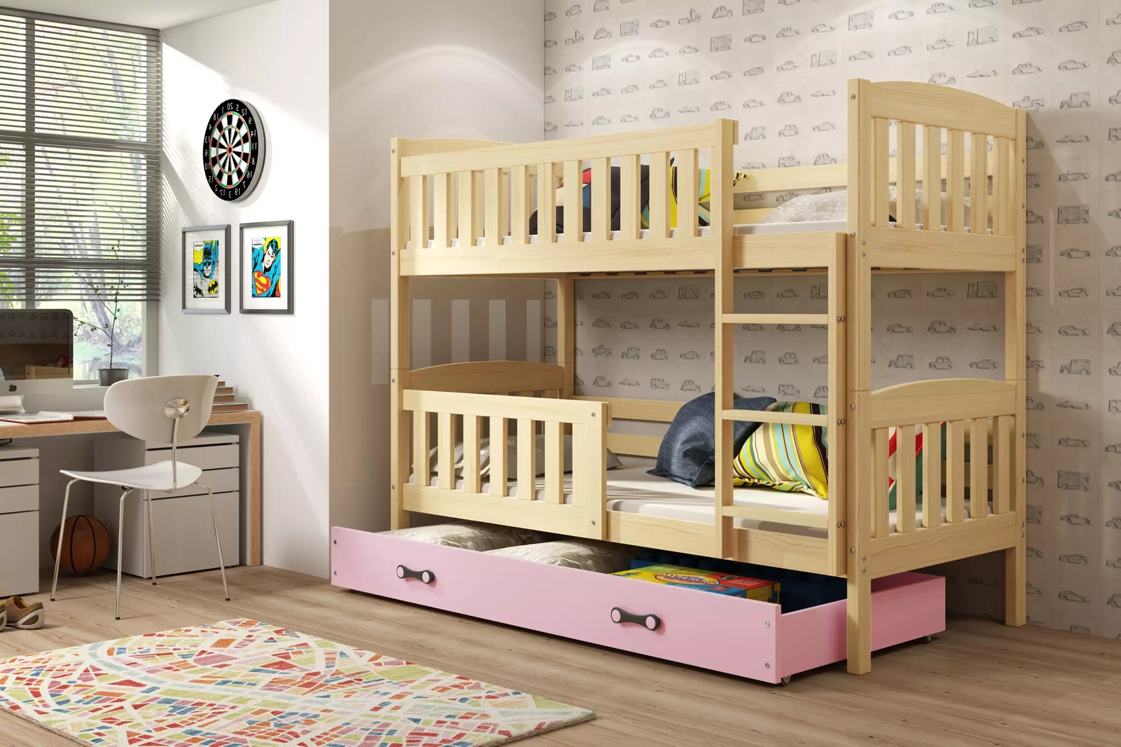 Łóżko piętrowe młodzieżowe model Kubuś sprawdzi się zarówno w pokoju dziewczynek, jak i chłopców. Jego przepiękna naturalna kolorystyka będzie znakomicie komponować się z innymi elementami wyposażenia. Mebel stanowi dobry wybór dla młodszych oraz starszych dzieci. Prezentowane łóżko młodzieżowe można zakupić wraz z przestronną szufladą, w której pociechy mogą przechowywać zabawki, ubrania, pościel oraz wiele innych rzeczy. Dzięki temu nie będą one dodatkowo ograniczać przestrzeni w pokoju, a możliwość ich szybkiego schowania ułatwi utrzymanie porządku w pomieszczeniu. Łóżko młodzieżowe Kubuś zapewnia dostatecznie dużą powierzchnię do spania, więc można przyjąć wygodną pozycję, zdrową dla kręgosłupa. Nośność każdego poziomu wynosi 100 kg, przez co mebel wyróżnia się wytrzymałością i stabilnością. Barierki są uniwersalne, o ich pozycji decydujesz podczas montażu. Kolor naturalne drewno podkreśliliśmy jedynie bezwonnym lakierem. Dzięki temu stelaż jest odporny na zabrudzenia, wytrzymały i bezpieczny. Dostosowany także dla alergików. Naturalne drewno ociepli każdy pokój.