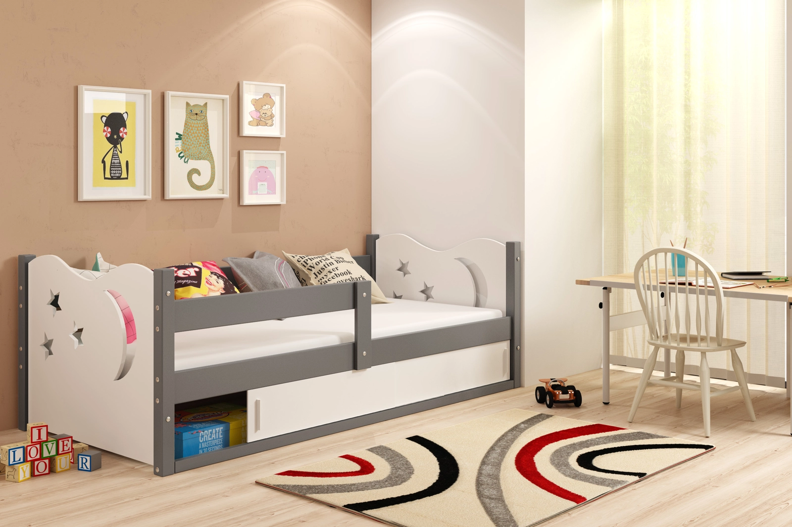 Mebel wyróżnia się solidnym wykonaniem oraz dużą dbałością o detale. Ozdobne uchwyty i subtelne wycięcia na frontach nadają całości lekkości i atrakcyjnego wyglądu. Powierzchnia spania o wymiarach 80 × 160 cm zapewnia dziecku komfort oraz swobodę ruchów podczas snu, a także wystarczającą ilość miejsca do codziennych zabaw.