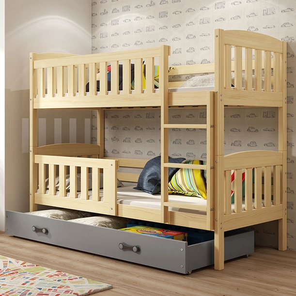 Łóżko młodzieżowe piętrowe KUBUŚ 90X190 z materacem i szufladą, sosna/grafitowe
