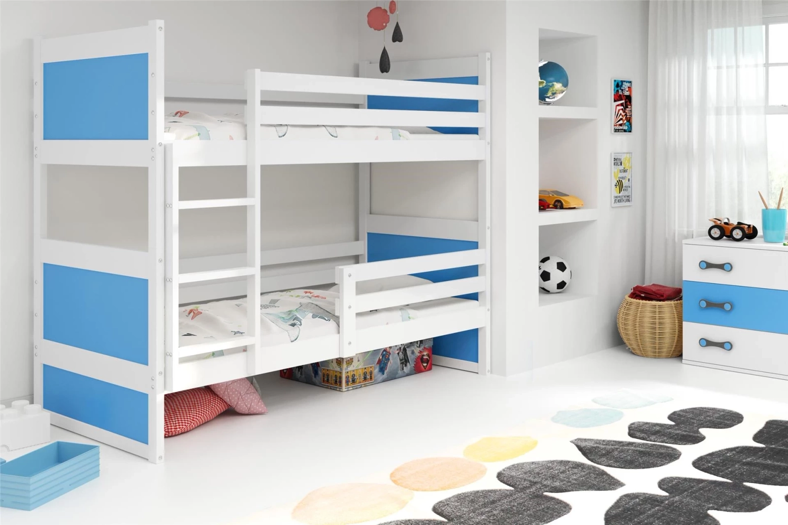 RICO charakteryzuje się nowoczesnym designem, który doskonale wpisuje się w trendy wyposażenia wnętrz. Biała rama tworzy elegancką i uniwersalną bazę, a niebieskie fronty dodają całości świeżości i wyrazistości, stając się atrakcyjnym elementem dekoracyjnym w pokoju młodzieżowym. Łóżko piętrowe 90x190 to także praktyczność – jego kompaktowe rozmiary pozwalają na oszczędność miejsca, co jest szczególnie ważne w przypadkach, gdy powierzchnia mieszkania jest ograniczona.