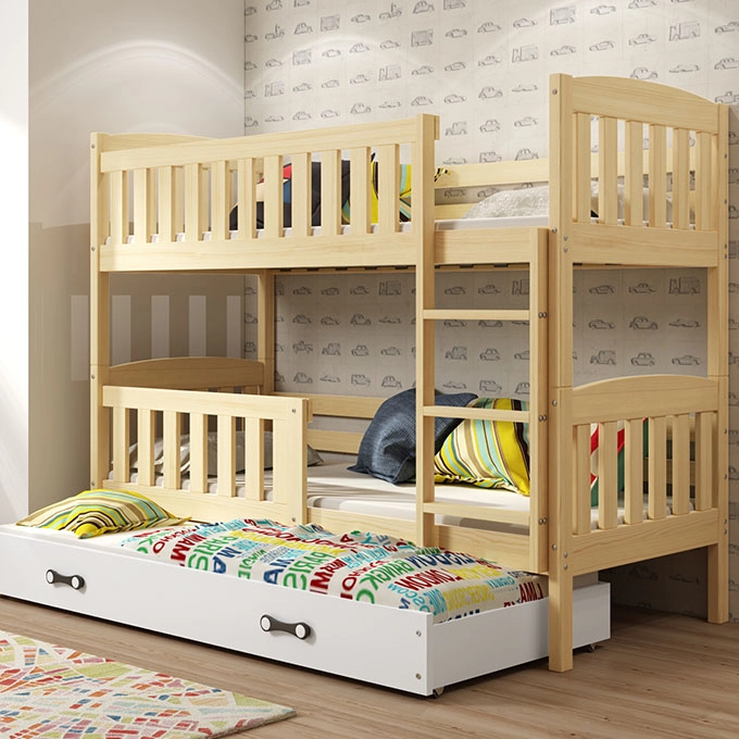 Łóżko piętrowe Kubuś 3-osobowe zostało stworzone z myślą o dużych rodzinach. Umożliwia urządzenie pokoju, w którym może spać aż troje dzieci.