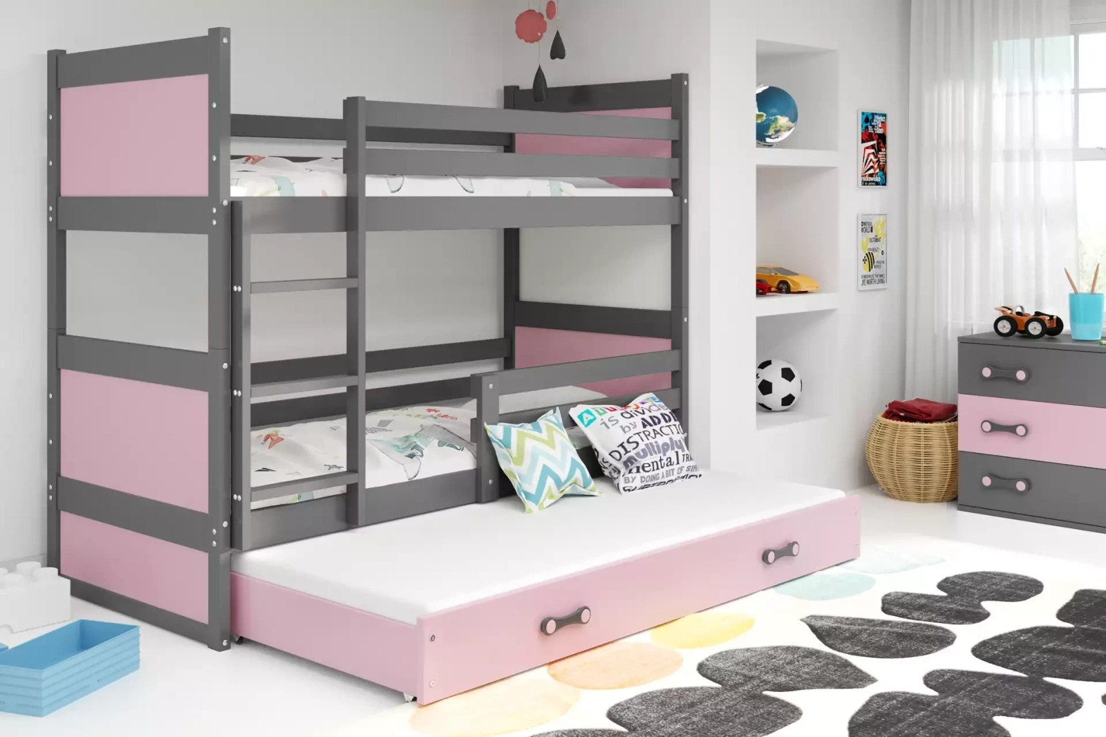 Dodatkowe miejsce do spania w postaci wysuwanej szuflady może być przeznaczone dla starszego dziecka lub przyjaciół Twoich dzieci, gdy przychodzą na noc. Rozmiar 90x190 sprawia, że jest to inwestycja na lata. Idealnie nadaje się do pokoju 3-latka i nastolatka. Kolor szary jest neutralnym, ale intensywnym rozwiązaniem. Dobrze komponuje się z szeroką gamą kolorów, które nadają charakteru wnętrzu. Różowy kolor szuflady jest delikatny, dlatego rozwiązanie to jest szczególnie polecane do pokoi dziewcząt i nastolatek. Zastosowaliśmy farbę antyalergiczną, która nie wywołuje alergii u dzieci o bardzo wrażliwej skórze.