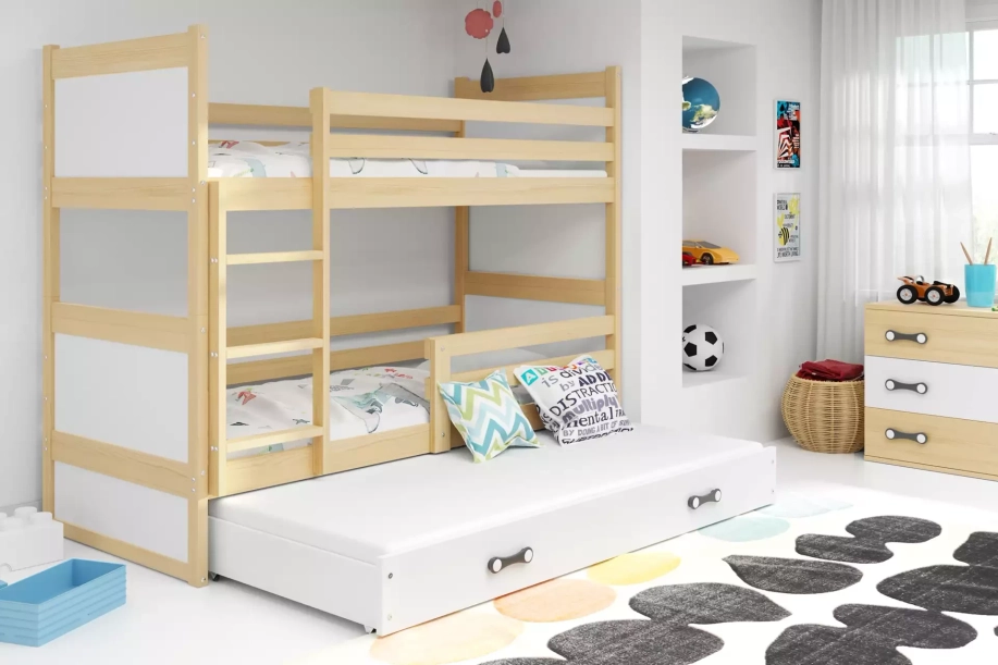 Łóżko RICO to idealne rozwiązanie do pokoju Twojego dziecka, łączące funkcjonalność z nowoczesnym designem. To łóżko młodzieżowe, które doskonale sprawdzi się w mniejszych pomieszczeniach, oferując dodatkowe spanie dla gości. Powierzchnia spania 90x190 cm zapewnia komfortowy odpoczynek, a solidna konstrukcja wykonana z naturalnego drewna gwarantuje trwałość i bezpieczeństwo. Rama łóżka, w naturalnym, nielakierowanym sosnowym kolorze, harmonijnie współgra z białymi frontami szuflady, dodając wnętrzu lekkości i świeżości.
