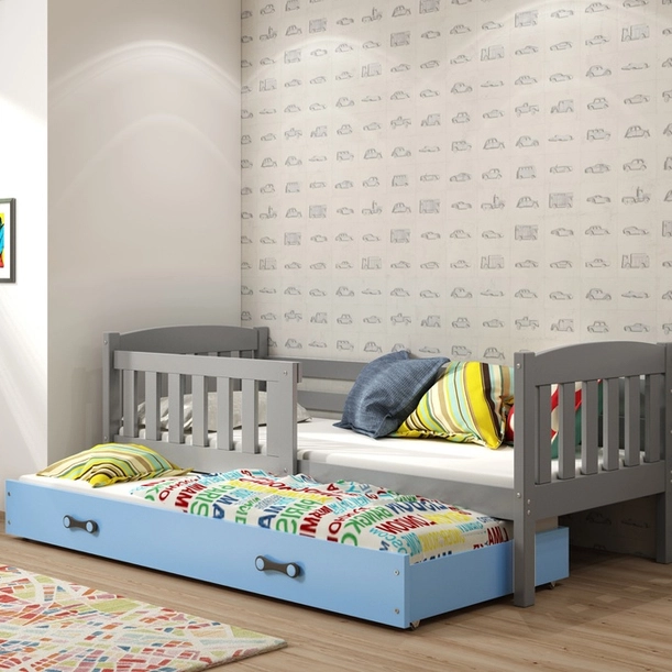Łóżko młodzieżowe wysuwane KUBUŚ 90X190 z materacem i szufladą, grafitowe/niebieskie