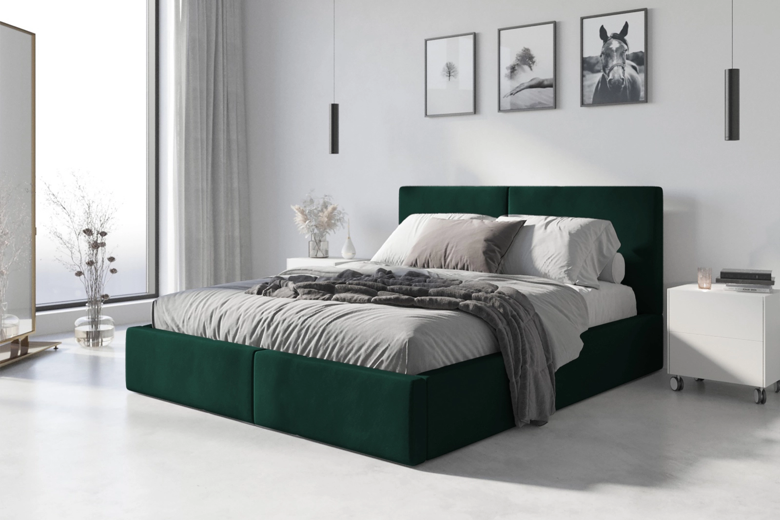 Jest to gustowne łóżko z pojemnikiem na pościel o nośności do 400 kg. Tapicerowane obicie w kolorze pięknej zieleni doskonale współgra z wieloma stylami aranżacyjnymi, dzięki czemu dopasujesz je i do nowoczesnego wnętrza, i do tego np. skandynawskiego.