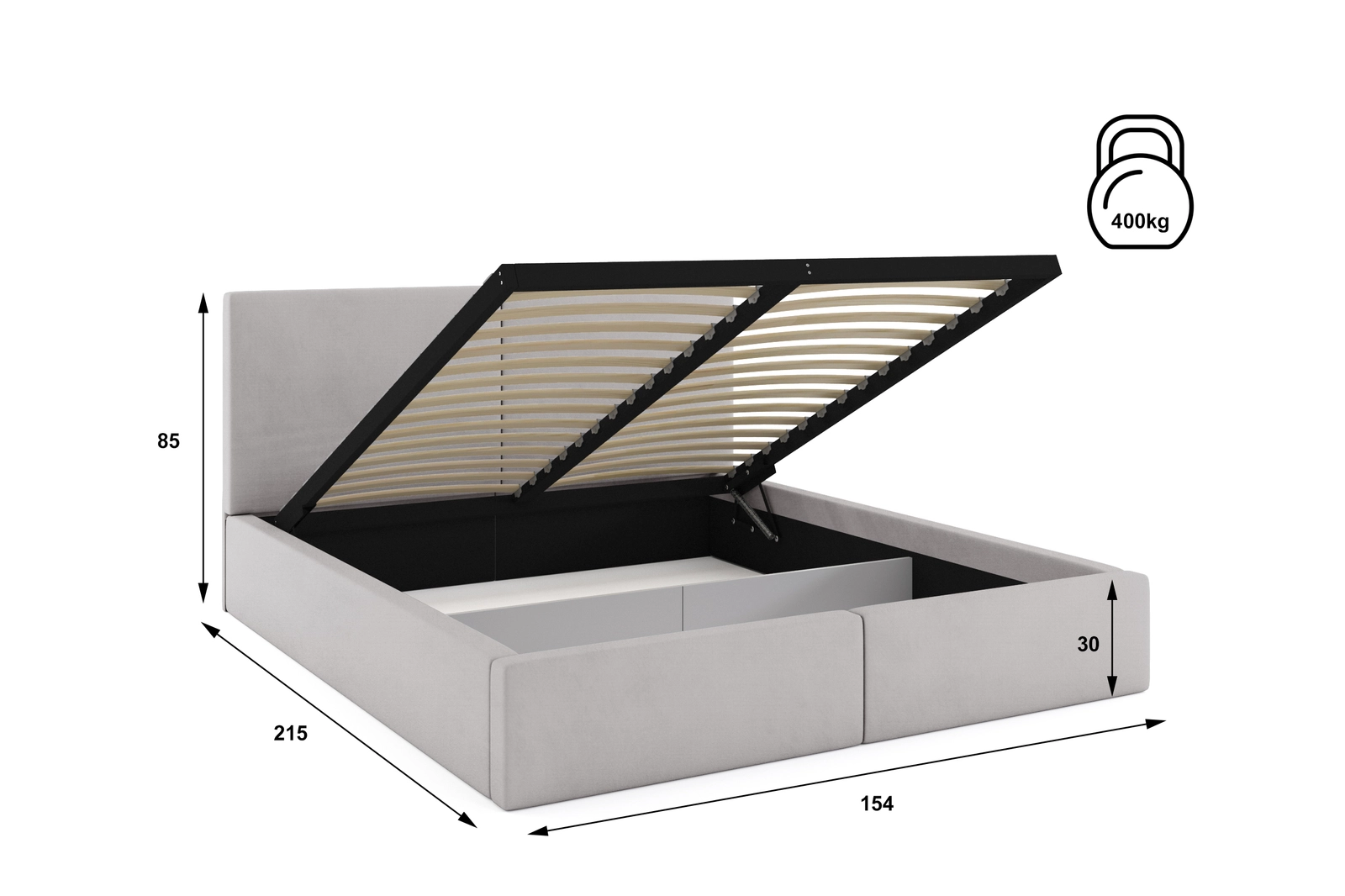 - Po podniesieniu stelaża przestrzeń podzielona przegrodą. W tylnej części brak spodu dna. W przedniej pojemnik na pościel.