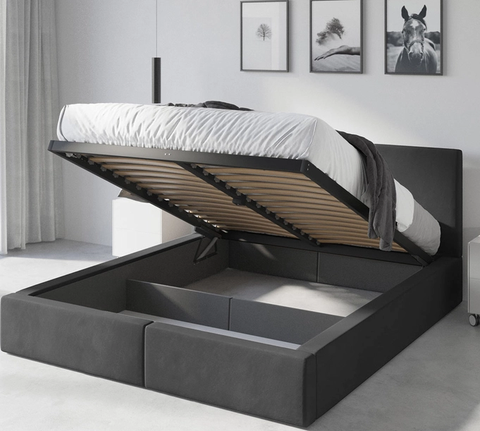 - Po podniesieniu stelaża przestrzeń podzielona przegrodą. W tylnej części brak spodu dna. W przedniej pojemnik na pościel.