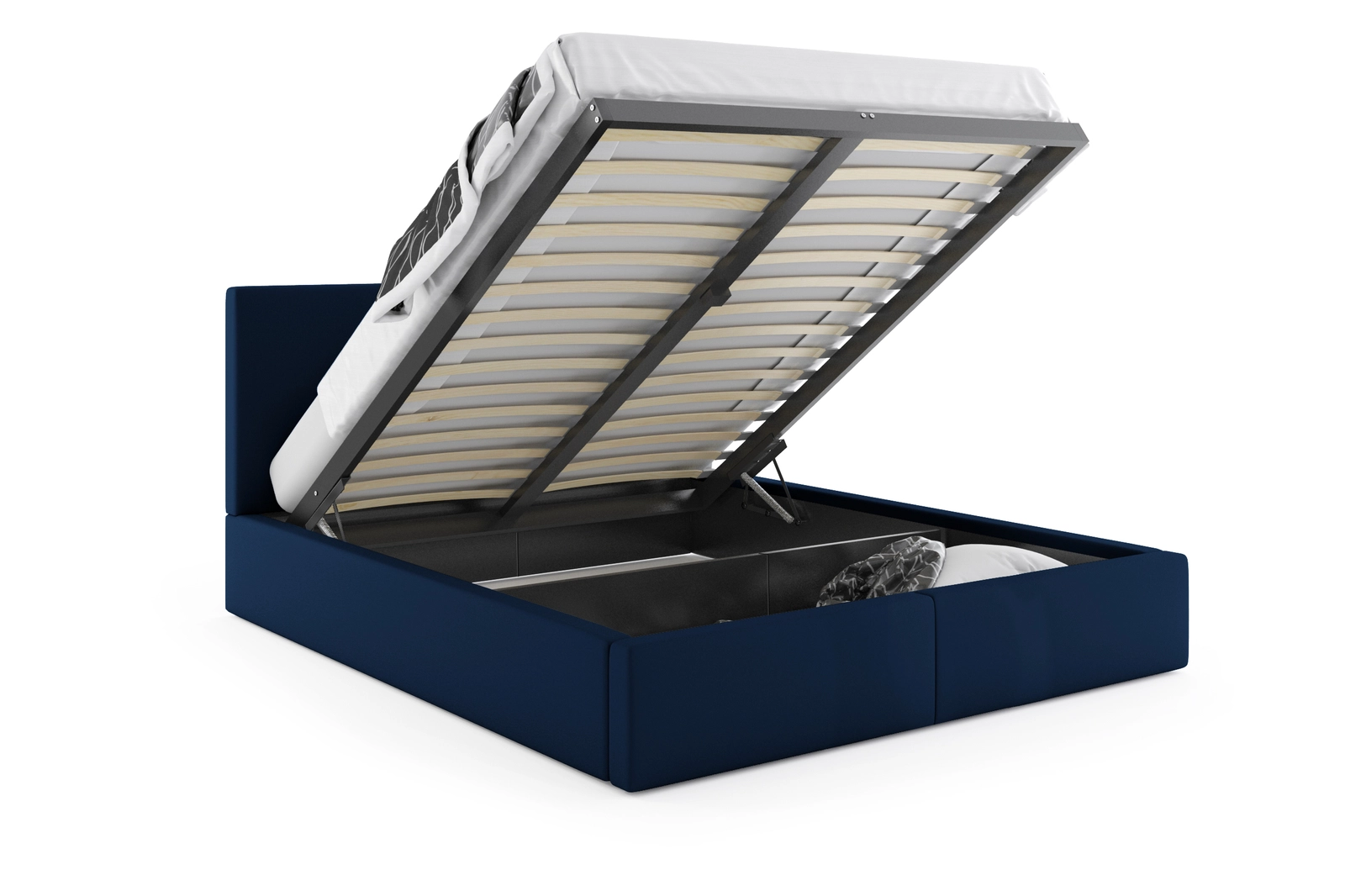 - Po podniesieniu stelaża przestrzeń podzielona przegrodą. W tylnej części brak spodu dna. W przedniej pojemnik na pościel.